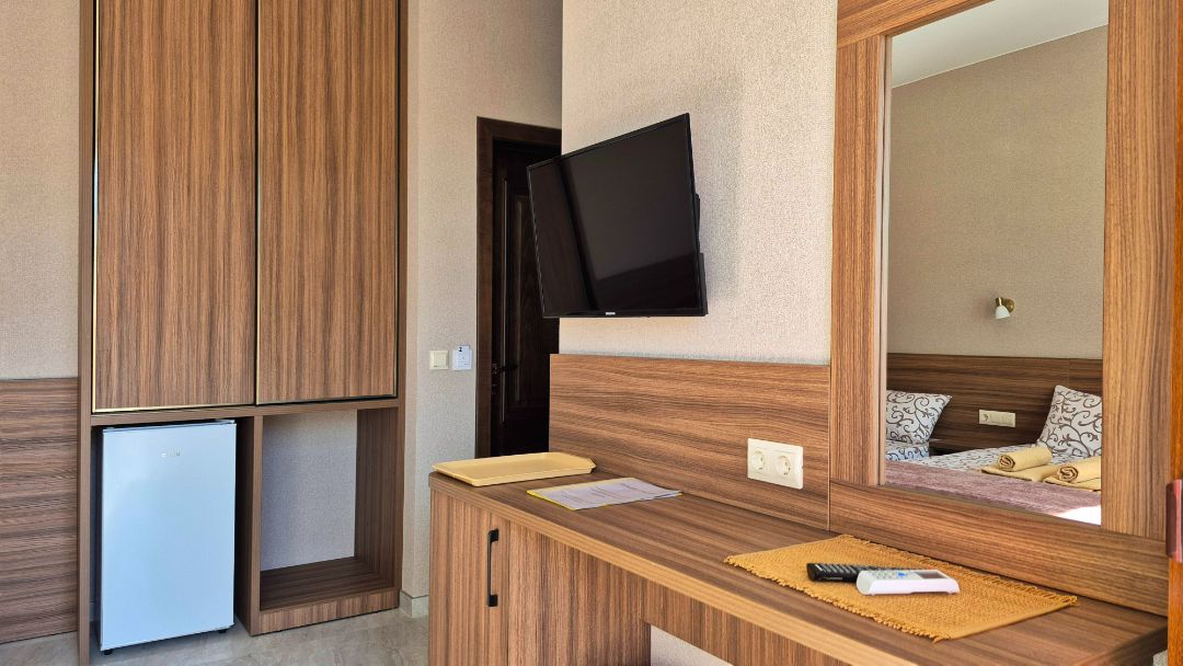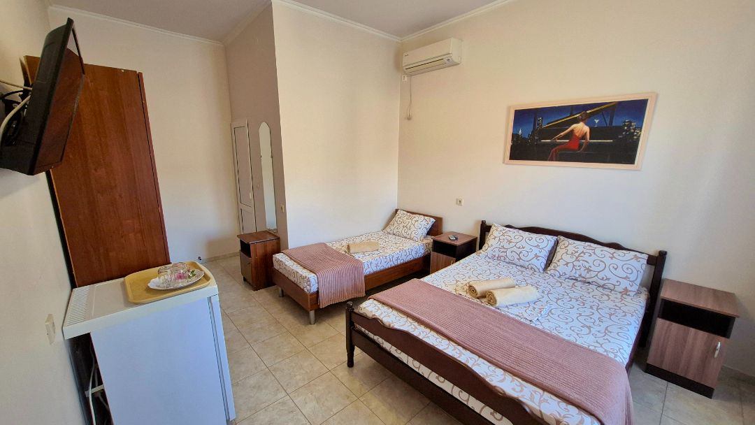 В номере есть телевизор, гардероб, вместительный холодильник, большое зеркало и прикроватные тумбочки. Ванная комната с душем, диспенсер с жидким мылом для гостей, туалетная бумага. Комфортную температуру обеспечивает сплит система кондиционирования. Чайник на этаже.